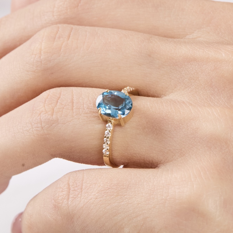 Anillo de Compromiso con Topacio London Natural con Certificado y engastes laterales. Disponible en Oro blanco, amarillo y rosa de 18k.