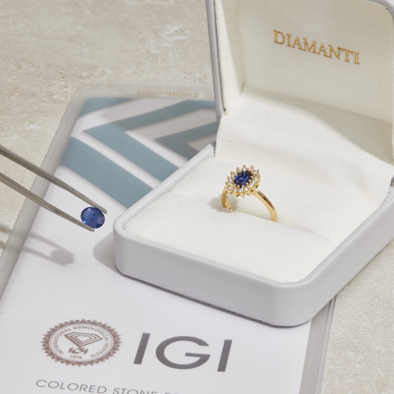 Anillo de Compromiso modelo Lady Di con Zafiro Azul Natural con Certificado y engastes laterales. Disponible en Oro blanco, amarillo y rosa de 18k.